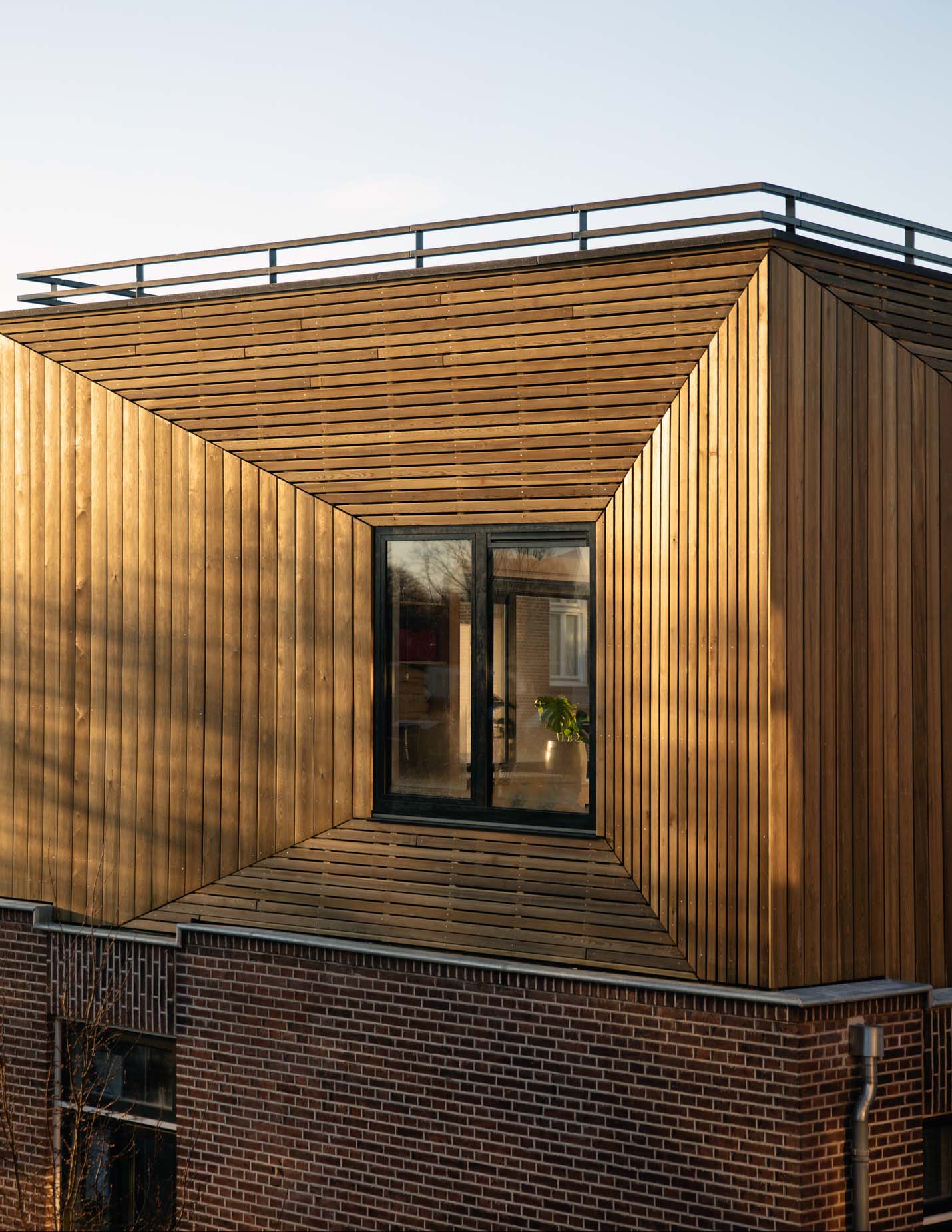 We ontwierpen een opbouw die de hoekpositie van de woning extra accentueert en ruimte biedt voor een slaapkamer, werkkamer en een riante daktuin. De constructie is uitgevoerd in duurzaam Siberisch Lariks-hout, met een warme uitstraling die mooi contrasteert met de bestaande baksteen. De geïntegreerde plantenbakken rondom het terras zorgen voor privacy, beschutting en een natuurlijke, groene sfeer midden in de stad.
